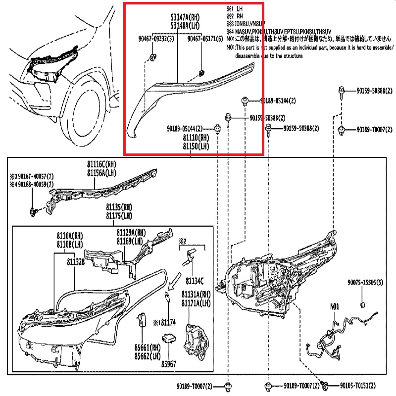 2.Vị trí lắp đặt của Thanh nẹp mạ crom trên đèn pha Toyota Fortuner (2020-2024) – 53147-0K120 Chính hãng